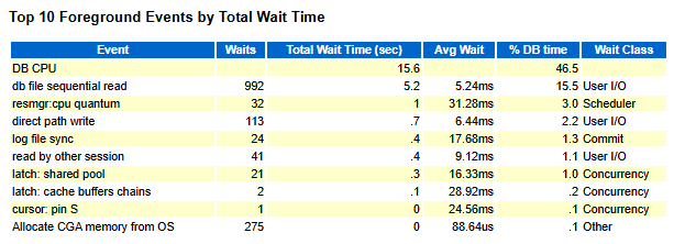 ポイント: 「Top 10 Foreground Events by Total Wait Time」セクションが最重要です。DB が何に時間を使っていたかが一目で分かります。