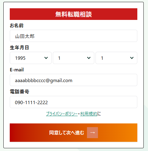 上記リンクをクリックすると以下画面が表示されるので、名前/生年月日/メールアドレス/電話番号を入力します。