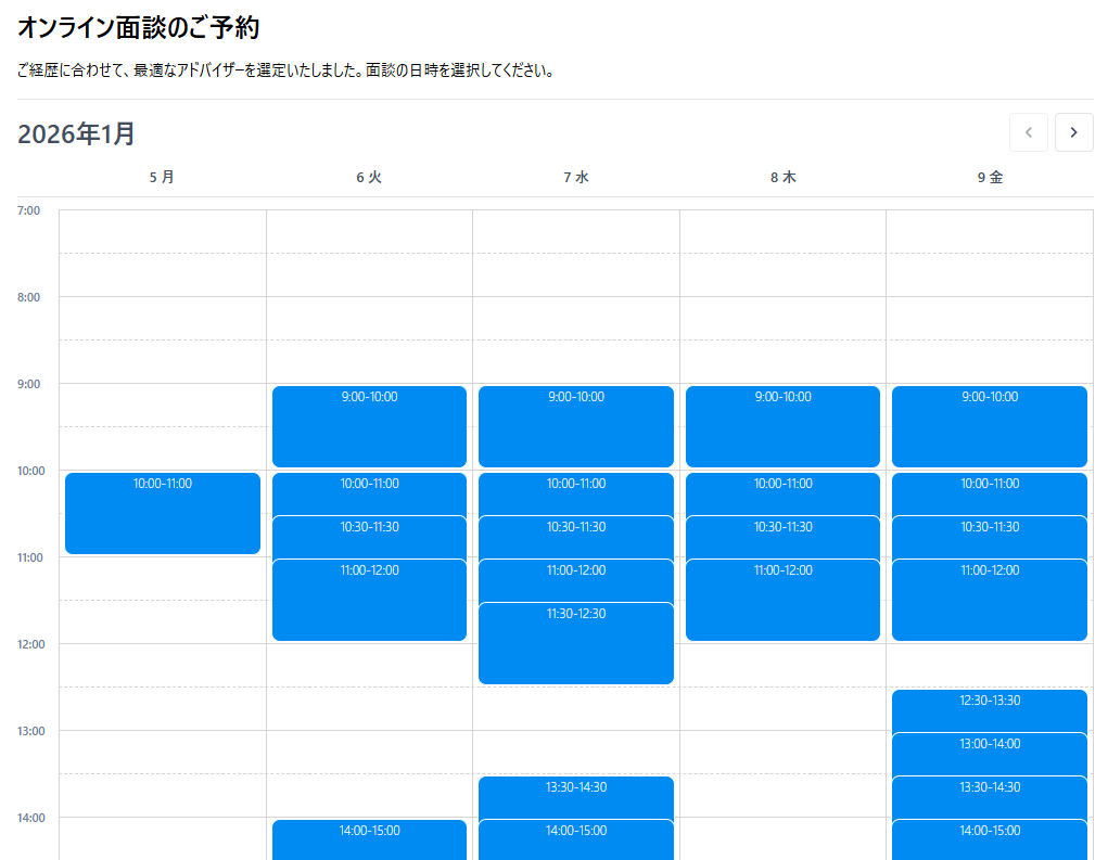 面談はオンライン(Zoom)での面談となり、以下のように予約が可能な日付/時間を選択します。
