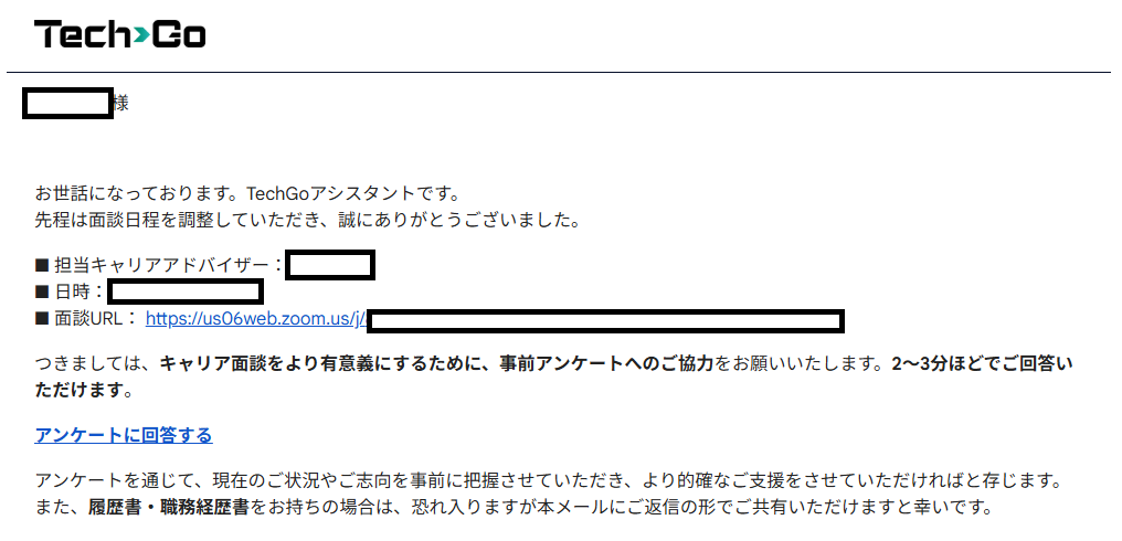 以下のようにZoomの面談URLが届くため、当日予約をした日時に以下のURLにアクセスして面談を受けましょう。
